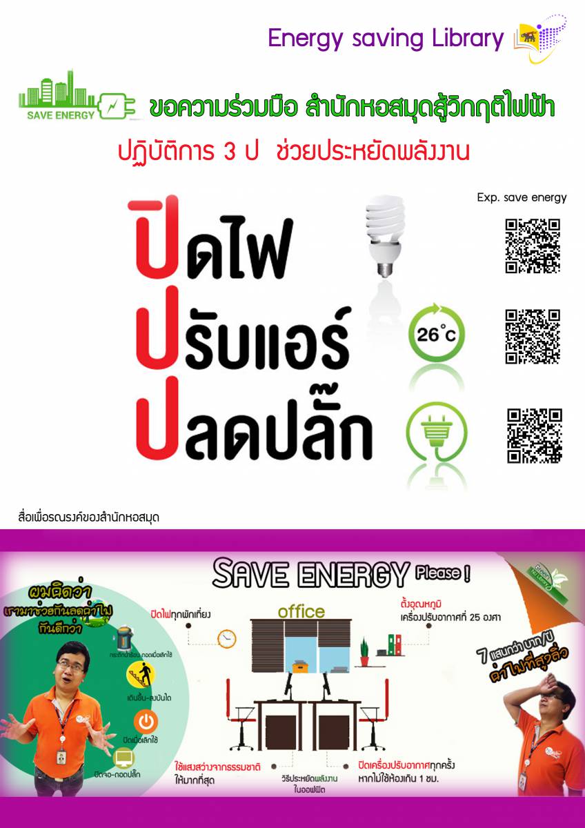 คณะกรรมการห้องสมุดสีเขียว จัดทำสื่อเพือกระตุ้นให้บุคลากร ช่วยกันประหยัดไฟฟ้า เพื่อลดค่าใช้จ่ายจากการใช้ไฟฟ้าต่าง ๆ ของสำนักหอสมุด