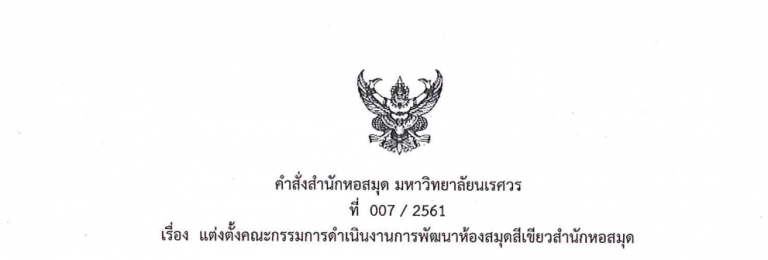 คำสั่งแต่งตั้งคณะกรรมการดำเนินงานการพัฒนาห้องสมุดสีเขียวสำนักหอสมุด ที่ 007/25615 July 20225 July 2022