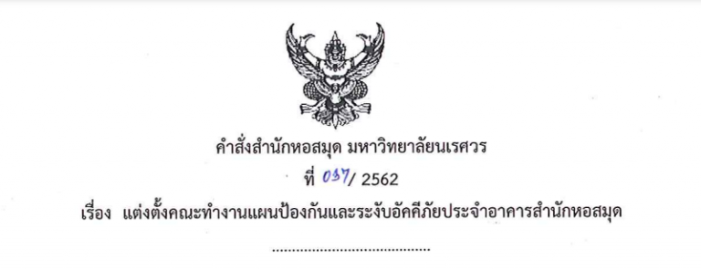 คำสั่ง แต่งตั้งคณะทำงานแผนป้องกันและระงับอัคคีภัยประจำอาคารสำนักหอสมุด
